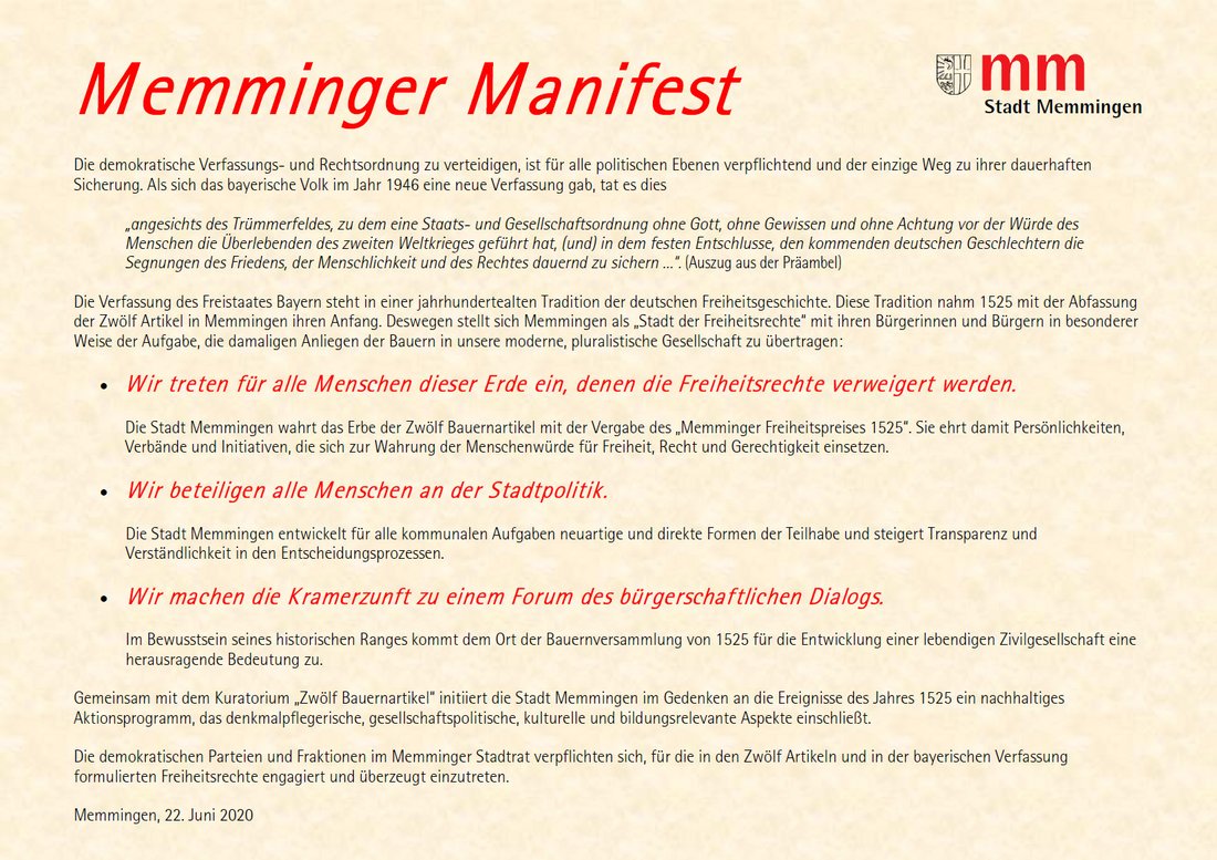 In seiner Sitzung vom 22. Juni 2020 hat der Memminger Stadtrat ein "Memminger Manifest" verabschiedet, mit dem sich die in ihm vertretenen demokratischen Parteien und Fraktionen verpflichten, zusammen mit allen Bürgerinnen und Bürgern für die in den Zwölf Artikeln und in der bayerischen Verfassung formulierten Freiheitsrechte engagiert und überzeugt einzutreten sowie die damaligen Anliegen der Bauern, ihren Kampf um die Freiheit, in unsere moderne, pluralistische Gesellschaft zu übertragen.