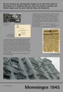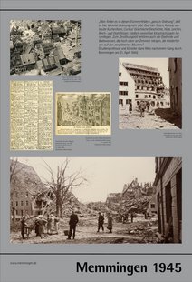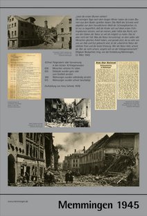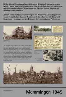 Die Informationstafeln erinnern nicht nur an die Not dieser Tage. Mit historischen Dokumenten, Fotografien und Zitaten soll auch deutlich werden, wie stark alle Lebensbereiche der Memminger Bürgerschaft bis unmittelbar vor dem Ende der Kampfhandlungen am 26. April 1945 vom nationalsozialistischen Herrschaftsapparat und seiner Kriegspropaganda durchdrungen waren.