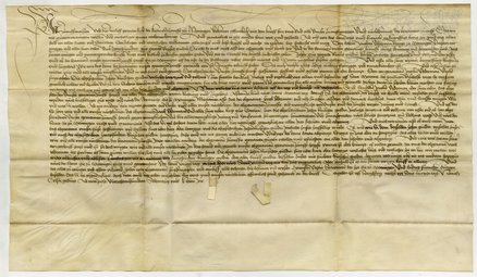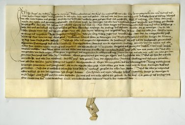 Auszug aus der Kaufurkunde von 1478/79: "Ich Yfo Strigel, der bildhöwer, burger zu Memingen, bekenn offentlich mit dem brief für mich und alle min erben, das ich mit gutem willen von miner notdurfft und mins bessern nutzes wegen [...] den erbergn, dem zunftmaister, den aylfen und gemainen zunftgenossen der crämer zunfte zu Memingen und allen iren nachkomen, umb vierhundert und sechtzig gut gerecht rinisch guldin, dero aller ich also bar und velliclich usgericht und bezalt bin [...], zu köffent gegeben ha [...] min stainhuse mitsampt der stallung und hofraitin darneben, hie zu Memingen an der Ahe, neben Hansen Mairs huse und hofraitin gelegen, mit aller siner wytin, rechtung und zugehörde [...] alles für ledig, richtig, aigen und unverkumbert, denn das die nachgeschriben zinse järlich uff sant Martins tag darus gänd, mit namen: Hainrich Huten zu Memingen fünf rinisch guldin vellzinß und den hailgen der kirchen zu Berg zwen rinisch guldin vellzinß." (Siegel von Stadtamman Ulrich Zehender, ausgefertigt am Dienstag nach St. Nikolaus 1478)