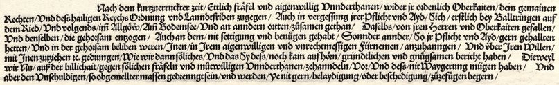 Präambel des Vertrags: "Als die Untertanen am Bodensee, auch im Algew uber und widder die Guolden Bull, der römischen und keiserlichen, hispanischen königlichen Maiestat, Churfürsten, Fürsten und anderer Stende des heiligen Reichs Reformation und aufgesetzten Landfriden durch ein Conspiration ein Pündtnus zusamen geschworen und sich drauf von ihren Herren, Junkhern und Obern abgeworfen, darzu etlichen derselben ihre Schloß, Flecken, Dörfer und Heuser gewaltiglich eingenomen, zum Teil verprent, auch etlich geplündert, ihr Diener, auch ander die Ihren gedrungen, ihnen zu schweren und Huldung zu tun, und damit Kriegs Empörunge im heiligen Reich auferweckt haben, dadurch denn die rö. kai. und his. kö. Ma., Churfürsten, Fürsten und ander Stende des löblichen Punds zu Schwaben den uberzognen und beschedigten ihren Pundtsverwanten gepürlich Hilf, Schutz und Schirm zu beweisen, auch tätliche Gegenwer furzunemen verursacht, und Todschleg, Brand und Nam, Verehrung Land und Leute daraus erwachsen."