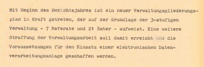 Seit Ende des 2. Weltkrieges informiert der (Ober-)Bürgermeister am Ende eines jeden Kalenderjahres über die Arbeit der Stadtverwaltung. Erhalten sind neben den maschinenschriftlichen Konzepten der Ämter und Dienststellen die zusammenfassenden Jahresrückblicke bzw. Jahresberichte als Rechenschaftsablegung gegenüber Stadtrat und Bürgerschaft.